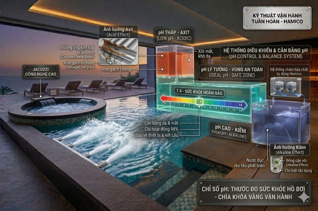 Trong quản lý hồ bơi chuyên nghiệp, có một con số “quyền lực” quyết định mọi thứ từ độ trong của nước đến sự thoải mái của làn da, đó chính là chỉ số pH. Tại Hamico, chúng tôi thường ví pH như “nhịp tim” của hồ bơi – chỉ cần chỉ số này bất ổn, toàn bộ hệ thống sẽ gặp vấn đề.
