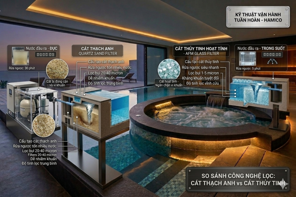 Nước hồ bơi trong vắt không chỉ nhờ vào Clo hay các chất xử lý, mà 90% sự thành bại nằm ở vật liệu lọc. Trong nhiều thập kỷ, cát thạch anh là “ông vua” của các bình lọc. Tuy nhiên, sự ra đời của Cát thủy tinh hoạt tính (AFM) đã tạo nên một cuộc cách mạng mới.