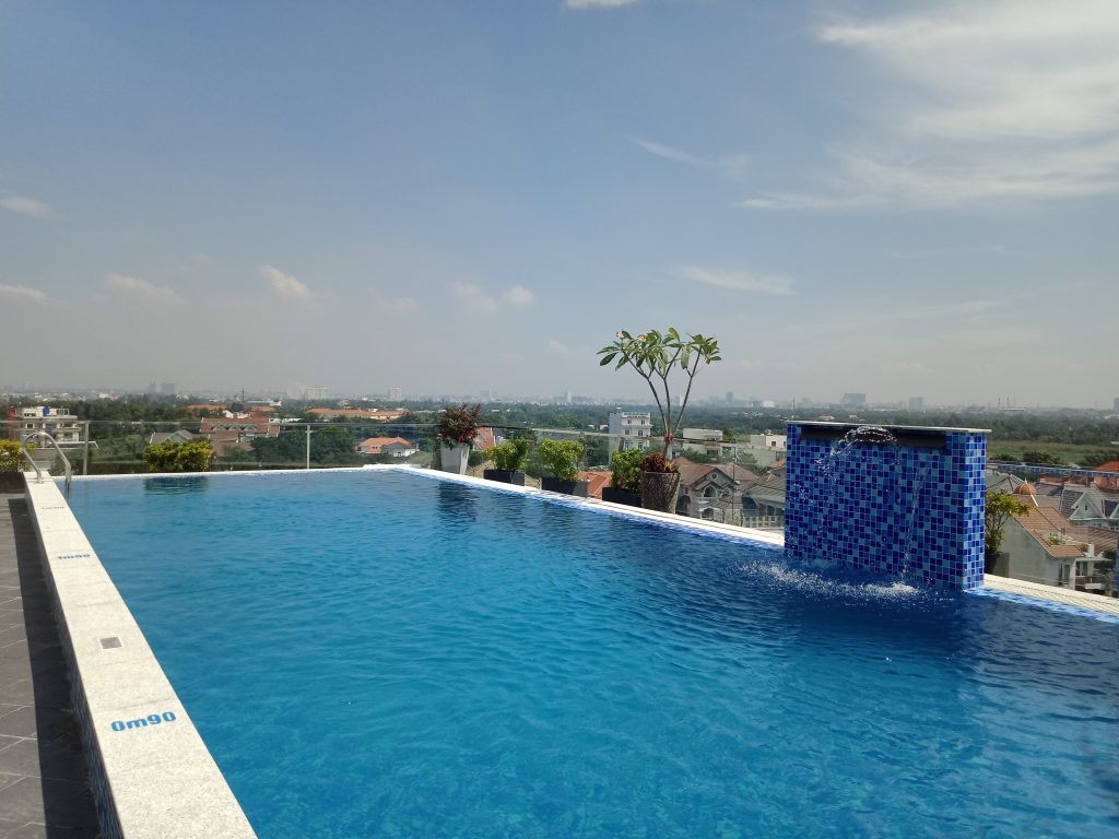 Thiết kế kính cường lực: Để tối ưu tầm nhìn, hồ bơi sân thượng thường kết hợp vách kính cường lực dày, tạo hiệu ứng “không biên giới”, giúp bạn thư giãn và ngắm nhìn toàn cảnh thành phố từ trên cao.