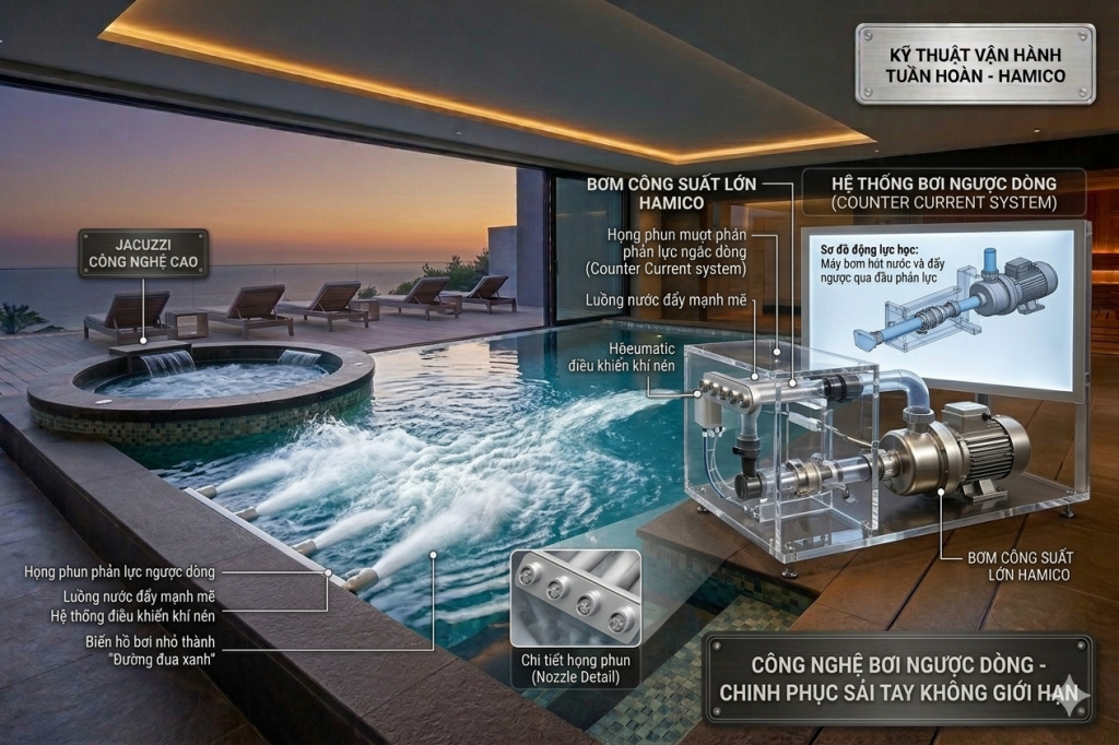 Bạn sở hữu một hồ bơi biệt thự với diện tích khiêm tốn? Bạn yêu thích bơi lội nhưng cảm thấy nhàm chán khi vừa quạt tay vài nhịp đã chạm thành hồ? Hệ thống bơi ngược dòng (Counter Current) chính là giải pháp công nghệ đột phá mà Hamico mang đến để giải quyết triệt để vấn đề này.