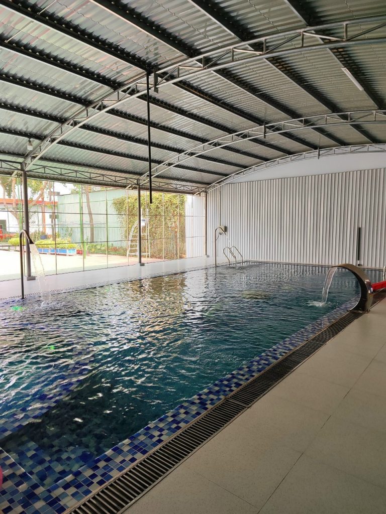 Điểm đặc biệt của dự án này chính là hệ thống mái che kiên cố. Việc lắp đặt mái che không chỉ giúp bảo vệ làn da của người bơi khỏi tia UV mà còn giúp giữ cho nước hồ luôn sạch sẽ, hạn chế lá cây và bụi bẩn. Điều này giúp gia đình chú Đề có thể thoải mái bơi lội vào bất cứ thời điểm nào trong ngày, kể cả khi trời nắng gắt hay đổ mưa.