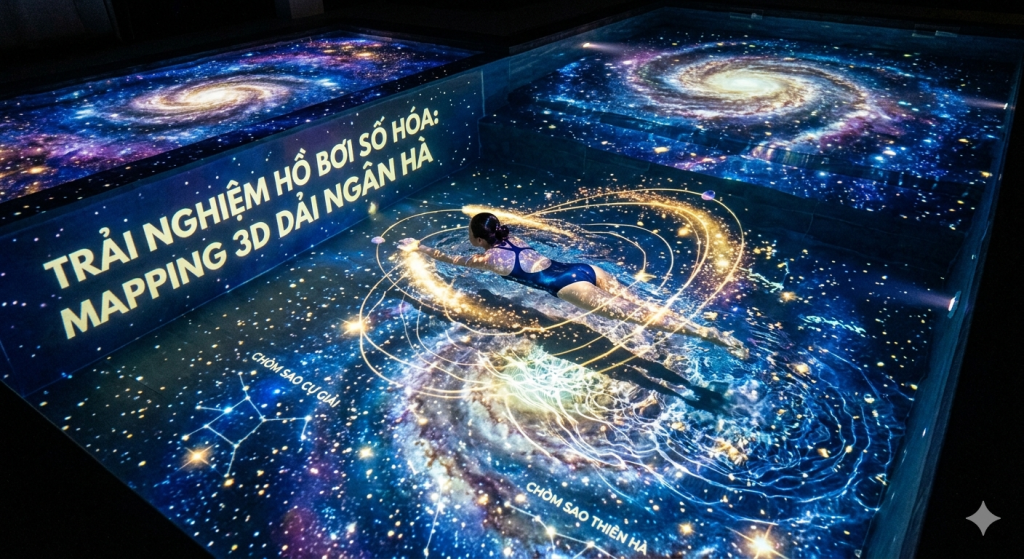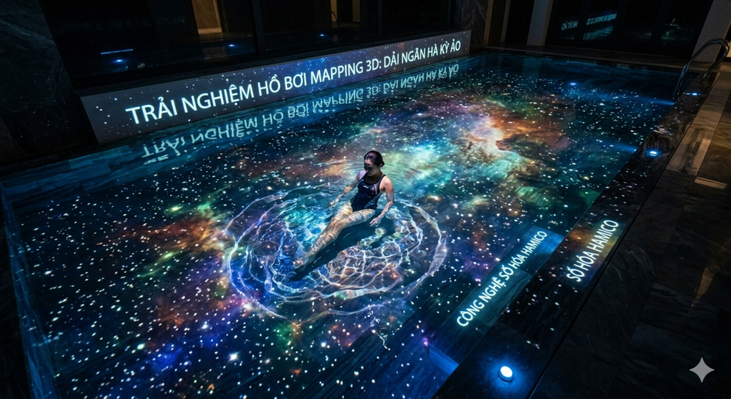 Nếu bạn nghĩ hồ bơi chỉ để bơi, công nghệ Mapping 3D và Digital Scenery sẽ khiến bạn thay đổi hoàn toàn suy nghĩ đó. Đây là sự kết hợp hoàn hảo giữa kỹ thuật trình chiếu ánh sáng cường độ cao và sự khúc xạ tự nhiên của nước.