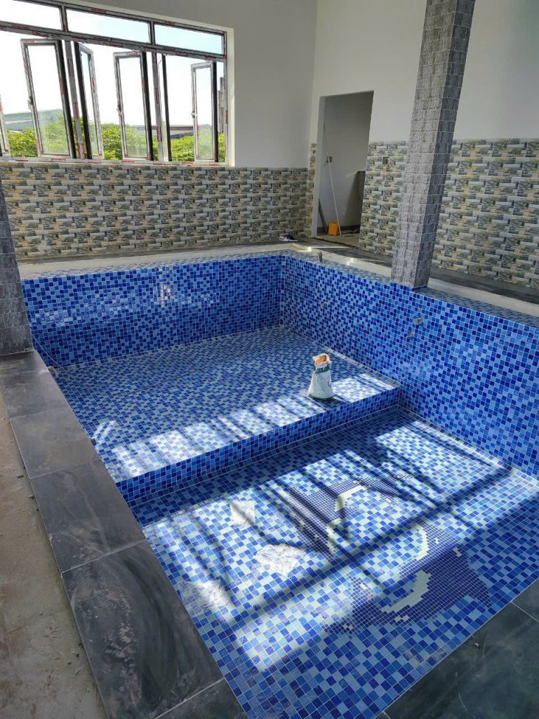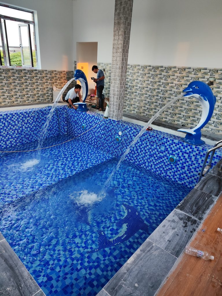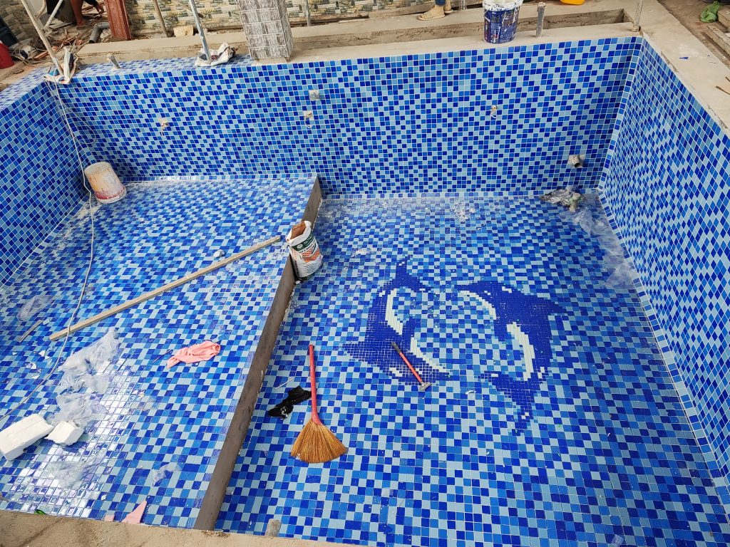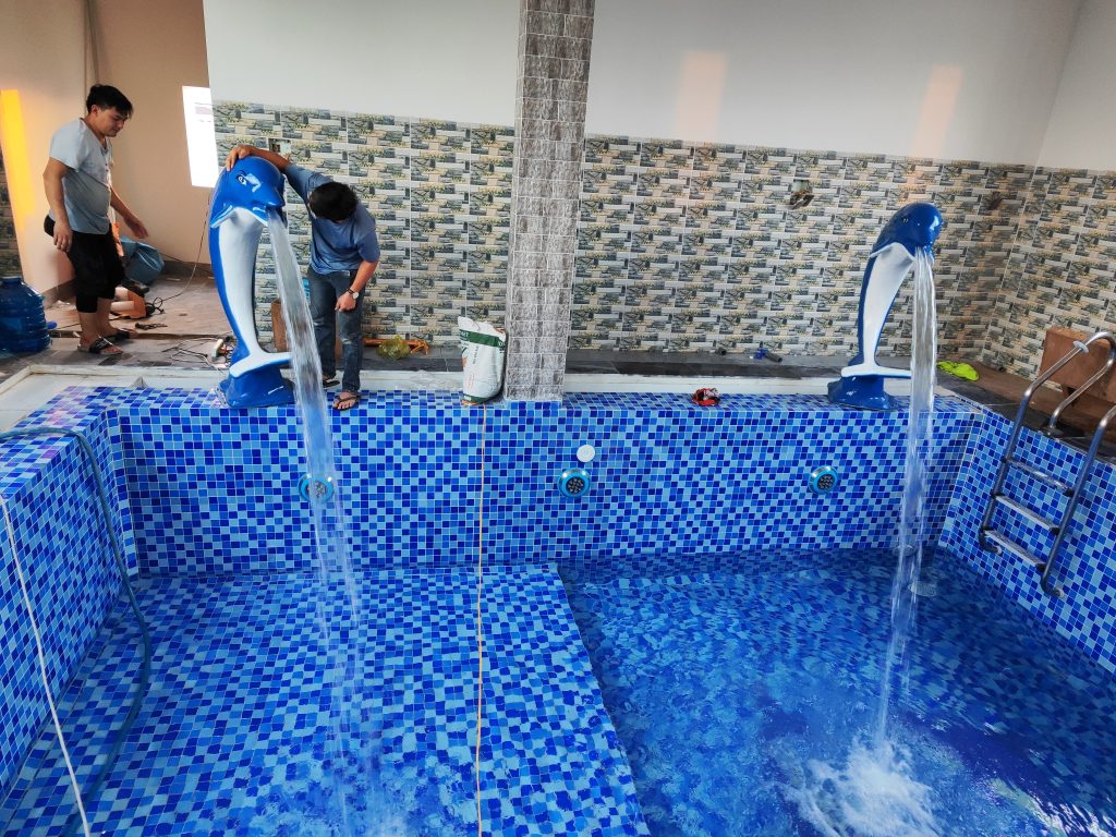 - Gạch Mosaic Thủy Tinh: Toàn bộ lòng hồ được ốp gạch Mosaic thủy tinh cao cấp. Dòng gạch này có khả năng bắt sáng tuyệt vời, giúp nước hồ trở nên xanh trong và lấp lánh hơn dưới ánh nắng mặt trời.