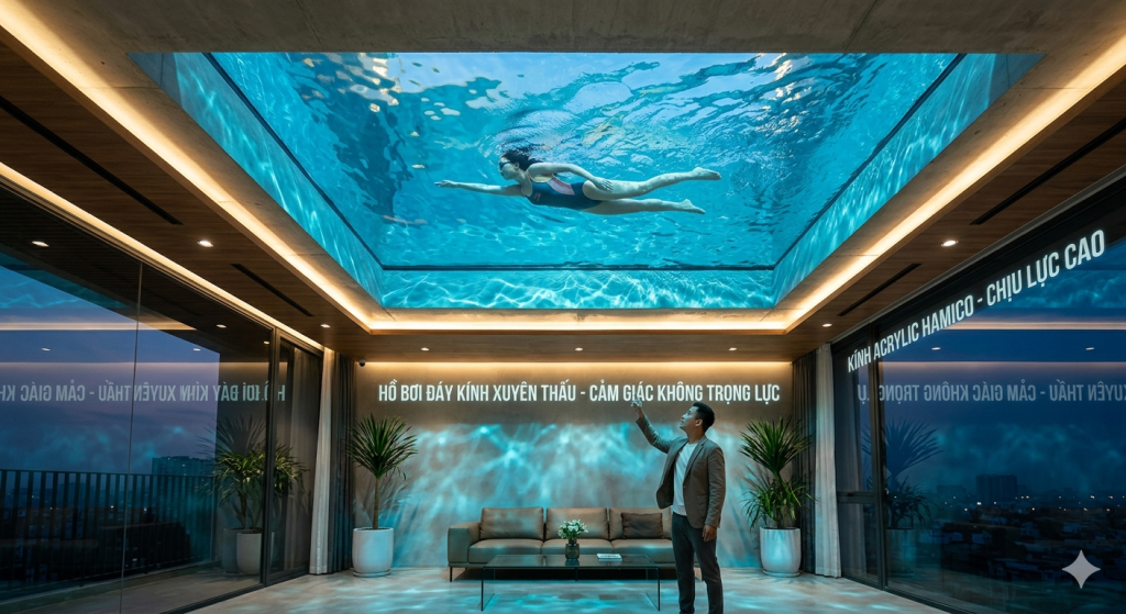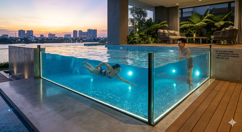 Nếu hồ bơi bê tông mang lại sự vững chãi, thì hồ bơi vách kính (hoặc đáy kính) lại mang đến cảm giác tự do, xóa tan mọi ranh giới giữa người bơi và không gian xung quanh. Đây là lựa chọn số 1 cho các căn Penthouse hoặc biệt thự có tầm nhìn triệu đô.