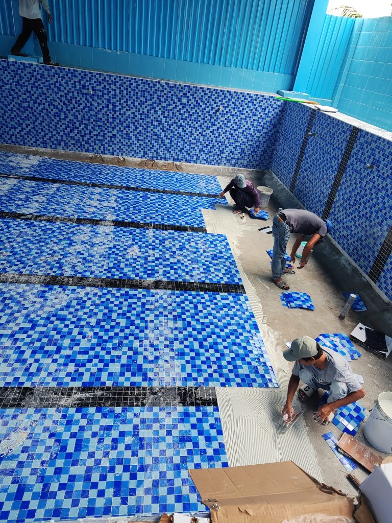 Toàn bộ lòng hồ được ốp lát gạch Mosaic thủy tinh full hồ. Việc lựa chọn vật liệu này mang lại 3 lợi ích lớn cho môi trường học đường: