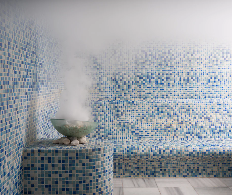 - Phòng xông hơi ướt (Steam Room): * Kết hợp kính cường lực và gạch Mosaic cao cấp, tạo không gian sang trọng và bền bỉ trong môi trường độ ẩm cao.