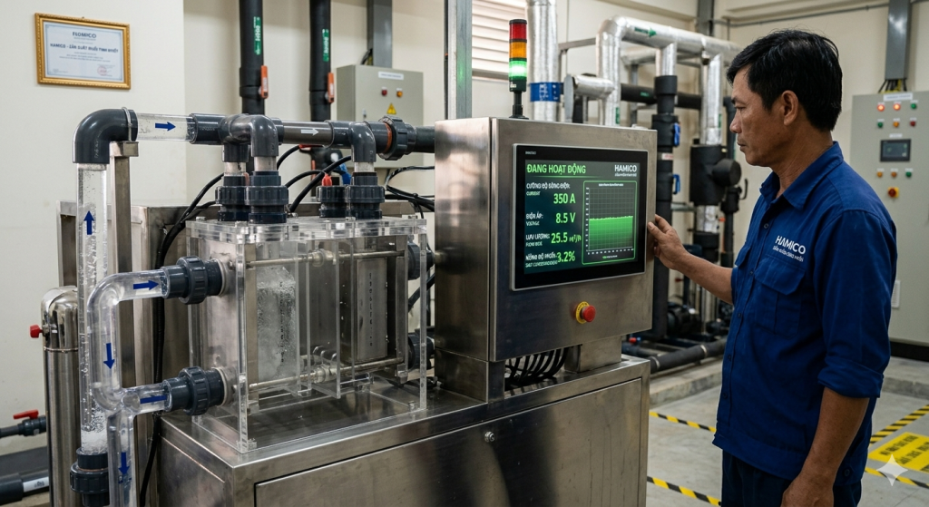 1. Máy điện phân muối: Lắp đặt trong phòng kỹ thuật, kết nối với hệ thống lọc.