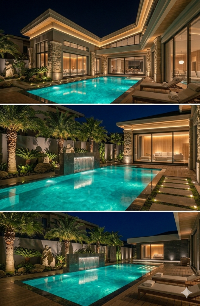 Khi màn đêm buông xuống, ánh sáng chính là “cây đũa thần” biến hồ bơi từ một công trình xây dựng khô cứng trở thành một tác phẩm nghệ thuật lung linh. Hệ thống đèn LED âm nước không chỉ giúp đảm bảo an toàn cho việc bơi lội ban đêm mà còn là yếu tố then chốt tạo nên đẳng cấp cho căn biệt thự.