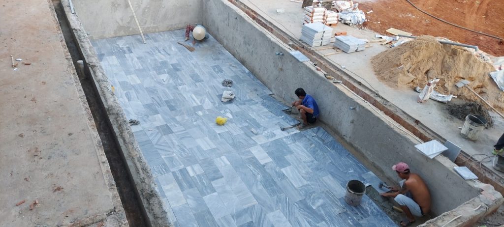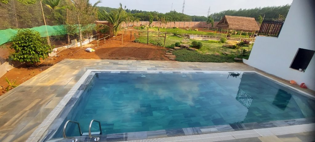 - Thi công đá xanh bao quanh: Phần sàn (deck) hồ bơi được lát đá tự nhiên chống trơn trượt, kết nối hài hòa với khu vực nhà chòi mái lá và thảm cỏ xanh mướt xung quanh, tạo nên một hệ sinh thái nghỉ dưỡng khép kín.