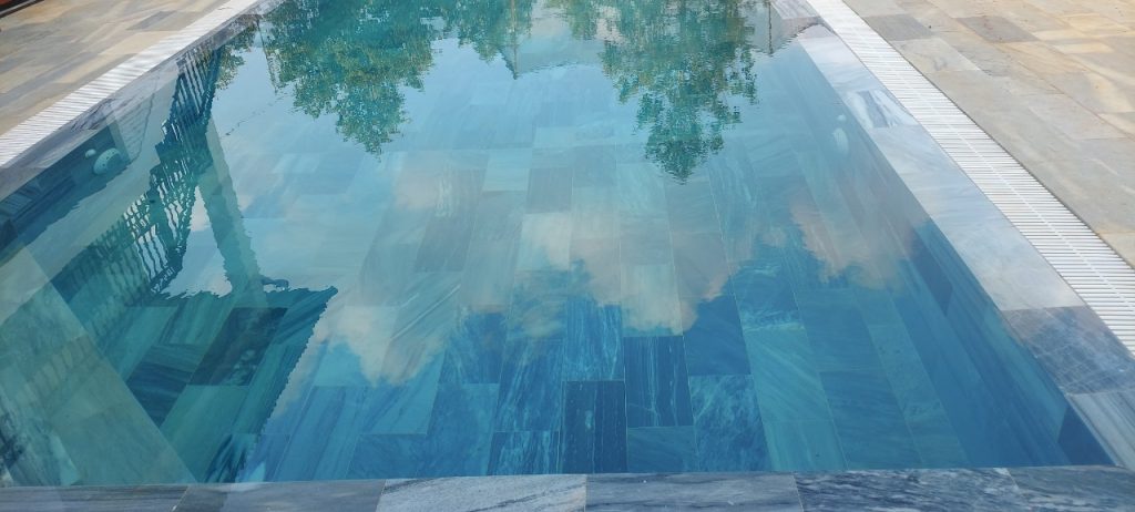 - Vẻ đẹp tinh tế từ đá sọc dưa: Điểm nhấn lớn nhất chính là toàn bộ lòng hồ được ốp đá sọc dưa tự nhiên. Những vân đá đen trắng xen kẽ khi kết hợp với ánh nắng mặt trời tạo nên hiệu ứng màu nước xanh ngọc bích sâu thẳm, mang lại cảm giác mát lạnh tức thì.
